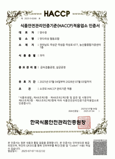 HACCP ǰ Һ ؿҸ мϰ, ̸ Ͽ ǰ Ȯϴ ü̸, ̹ ǰ ڷ 㶱 ǰ Ÿ ǰ 5 , ȿⰣ 2025 7 4Ϻ 2028 7 3ϱ 3Ⱓ̴.