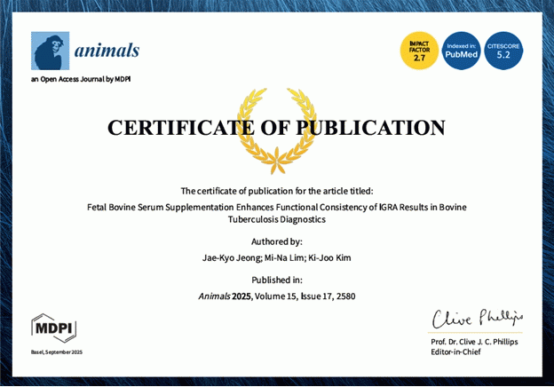 ش Fetal Bovine Serum Supplementation Enhances Functional Consistency of IGRA Results in Bovine Tuberculosis Diagnostics, ¾û(FBS, Fetal Bovine Serum) ̰ ˻ ΰ Ȯ Ű ȿ Ȯ ̴.